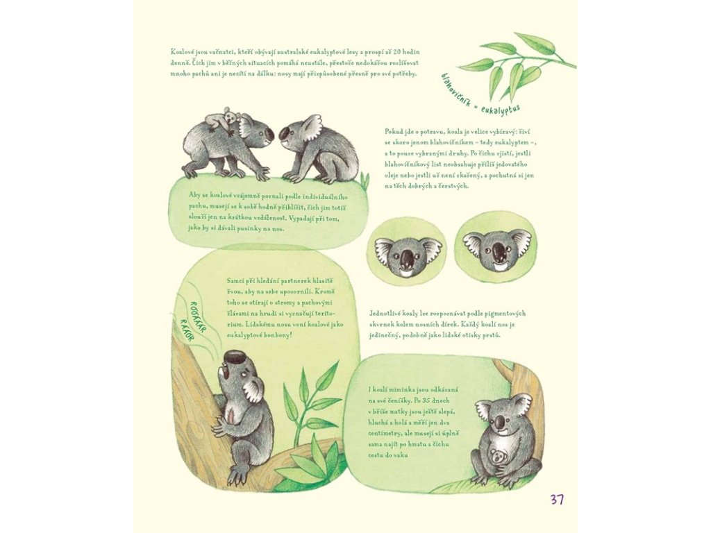Víte, co mají společného koala, slon, ježura a antilopa sajga? Všichni mají úžasně chytré nosy! Tato bohatě ilustrovaná sbírka zvířecích nosů a čumáků přináší portréty podivuhodných živočichů ze všech světadílů. Která zvířata se nosem pusinkují? Kdo používá čenich jako šnorchl? A kdo umí vyčenichat výbušniny a odhalit pašeráky? To všechno se zvídavé děti dozvědí v téhle knížce díky přívětivým textům, doprovodným přehledům a hravým ilustracím.