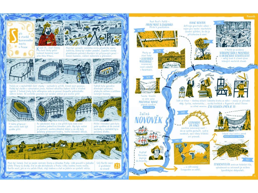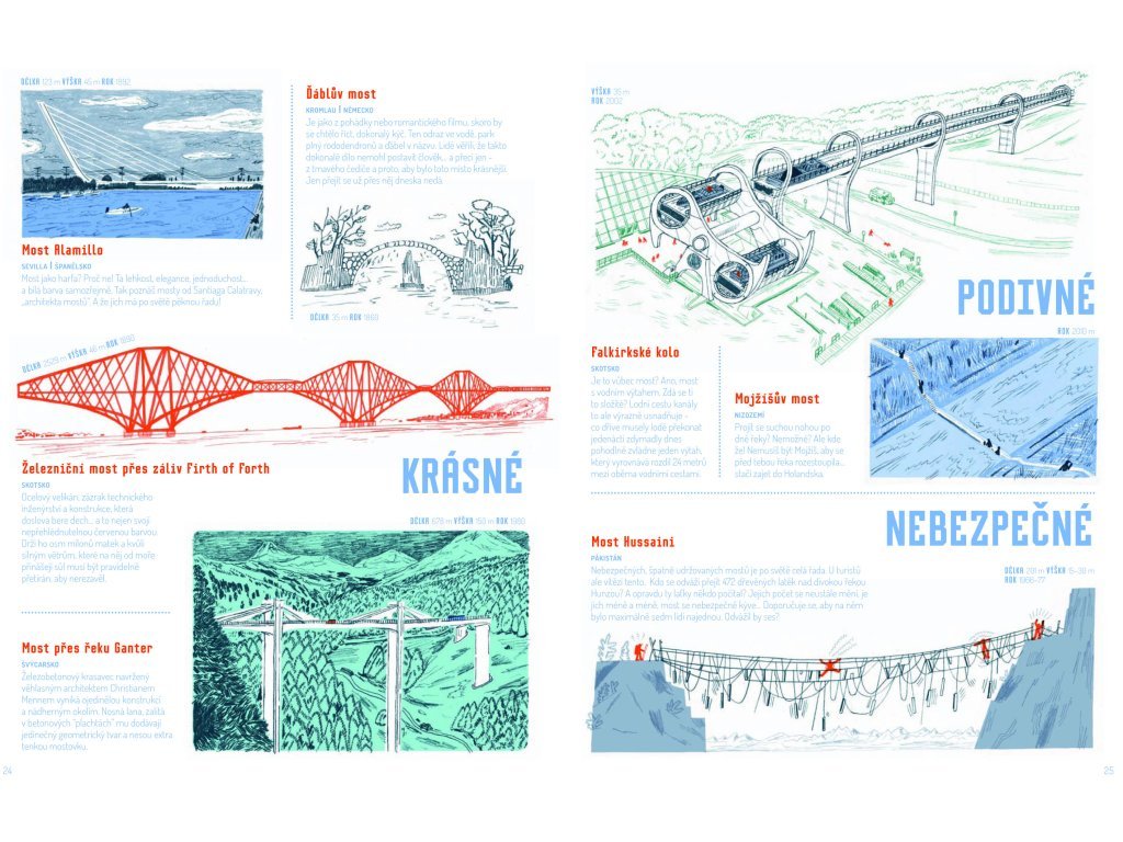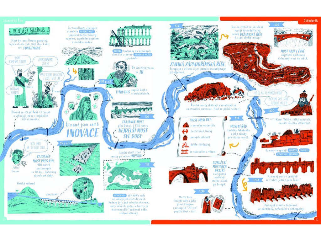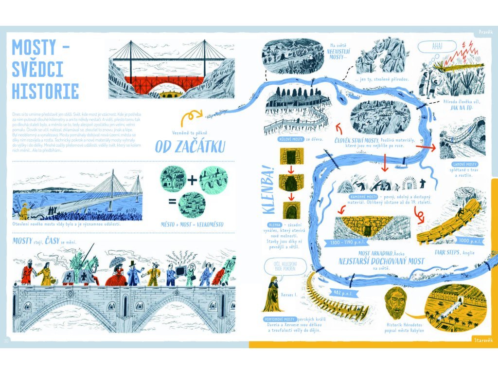Člověk mosty buduje od chvíle, kdy poprvé přešel spadlý kmen stromu přes řeku. Tato velká obrazová kniha přináší příběhy více než sedmdesáti mostu — od Golden Gate v San Francisku přes francouzský akvadukt Pont du Gard až po náš Karlův. Vysvětluje, jak se mosty staví a jakou roli hrály v dějinách i v umění. Ukazuje, že na mosty lze narazit také u zubaře, při sportu nebo hře na hudební nástroj. A navíc prověří vaše konstruktérské dovednosti při stavbě špagetového mostu.