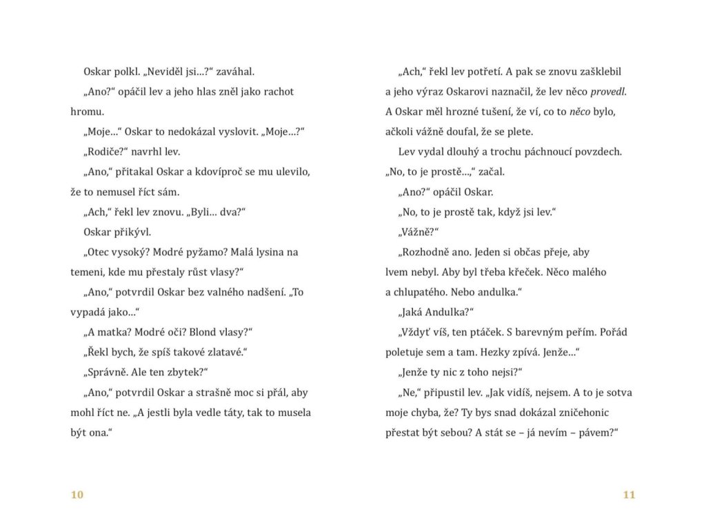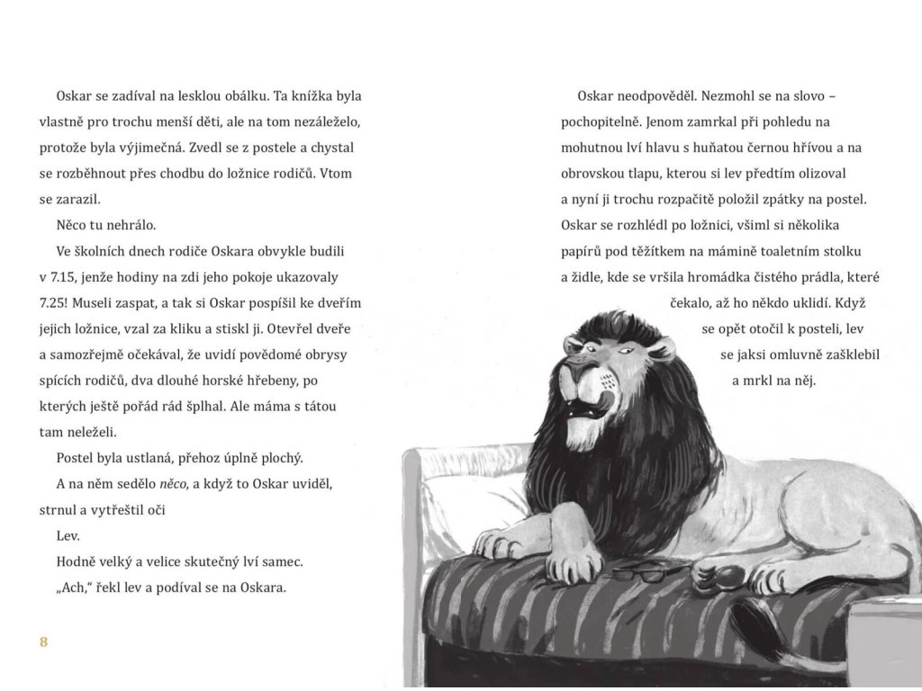 Oskar se jednoho dne vzbudí a rodiče nikde. Místo nich je tu najednou obrovský mluvící lev. Když Oskarovi dovolí sníst tolik sušenek, kolik chce, a desetkrát mu přečte jeho oblíbenou pohádku, Oskar si uvědomí, že to s ním možná nebude tak špatné. Za jediný víkend zažije Oskar fantastické chvíle a nejrůznější dobrodružství ve škole i jinde. Lev, který se dokáže proměňovat v různá zvířata, pomáhá Oskarovi překonat samotu, čelit šikaně a přenést se nejen v čase, ale hlavně přes svůj bol ze ztráty. A na konci předvede Oskarovi ještě jednu úžasnou proměnu: svou vlastní i chlapcovu.