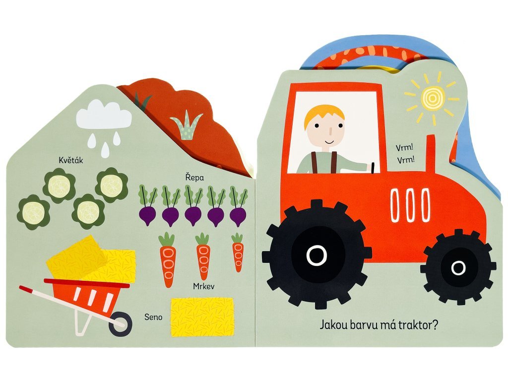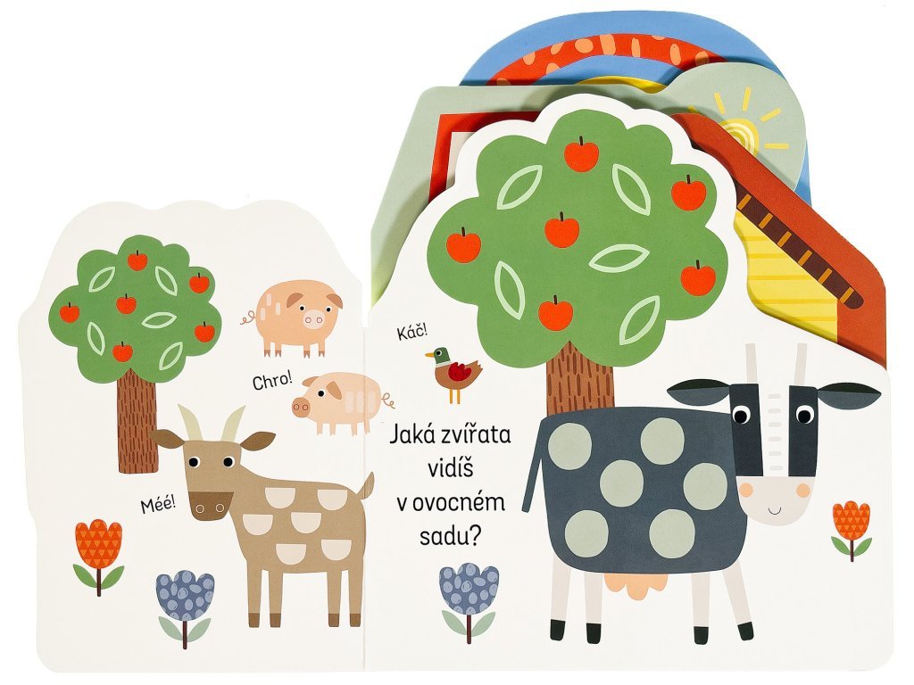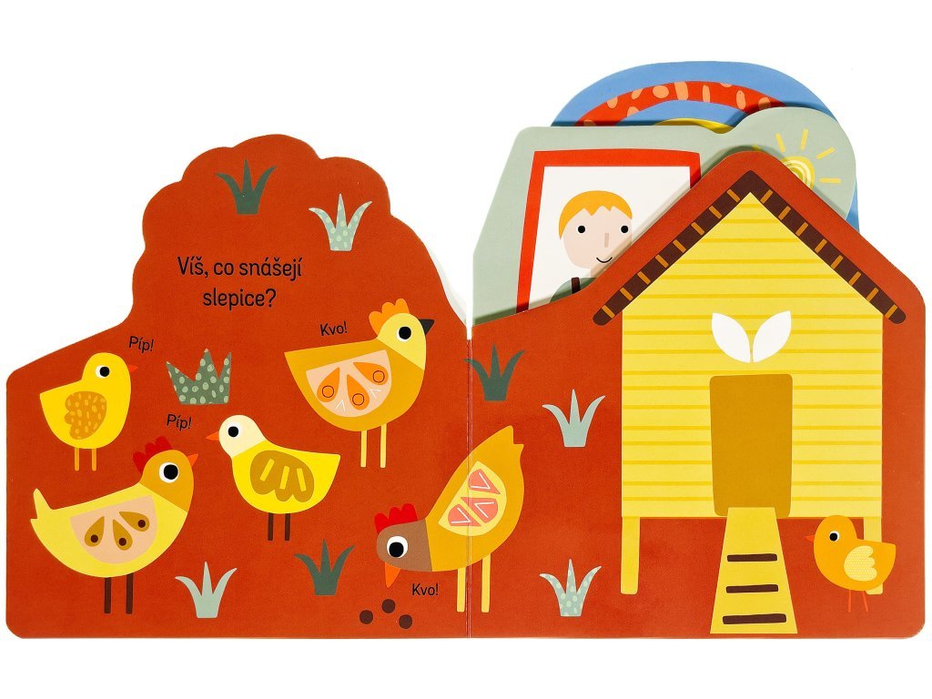 Zjisti, co všechno se děje na farmě, v této zajímavě pojaté knížce. Leporelo má různě tvarované stránky, které zaujmou především dětské prstíky. Zpod dalších stránek vykukují obrázky, které vzbudí u malých čtenářů zvědavost - co asi bude na další a další stránce? Kniha s milými ilustracemi obsahuje popisky zvířat a předmětů z farmy a doplňující otázky, a tak si můžete s dítětem povídat na toto tolik oblíbené téma a pomáhat mu rozšiřovat slovní zásobu a rozvíjet fantazii.