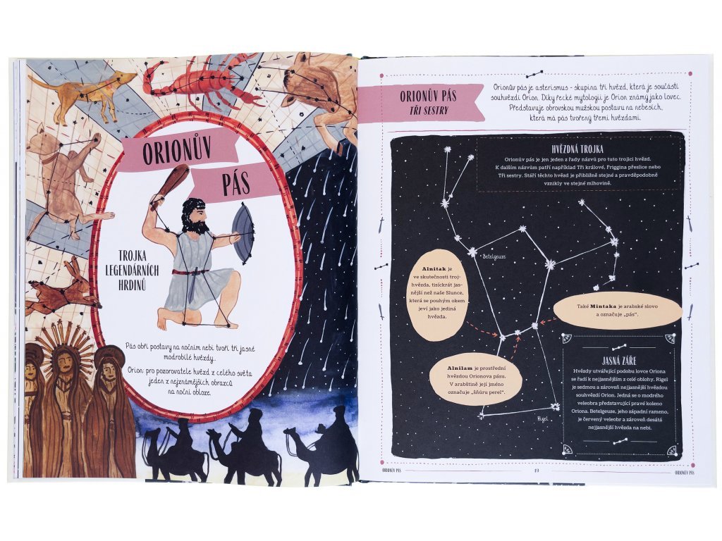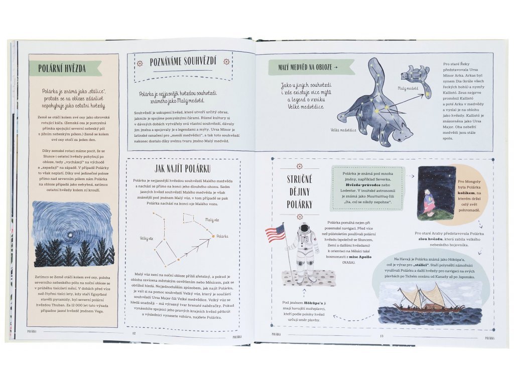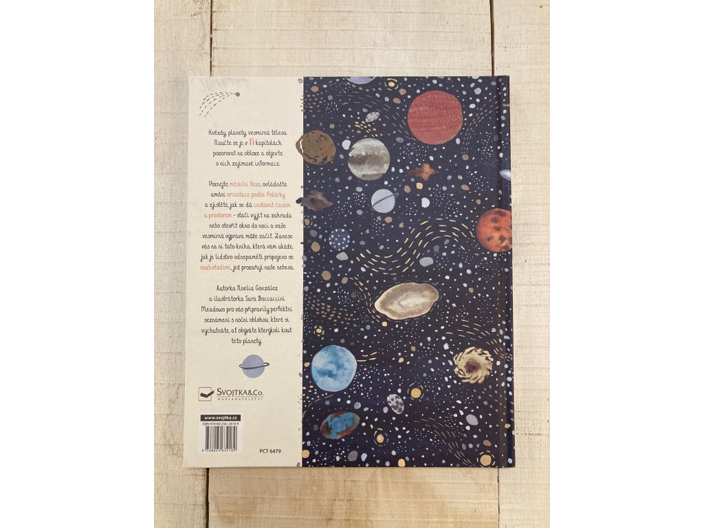 Hvězdy, planety, vesmírná tělesa. Naučte se je v 15 kapitolách pozorovat na obloze a objevte o nich zajímavé informace. Poznejte měsíční fáze, ovládněte umění orientace podle Polárky a zjistěte, jak se dá cestovat časem a prostorem – stačí vyjít na zahradu nebo otevřít okno do noci a vaše vesmírná výprava může začít. Zanese vás na ni tato kniha, která vám ukáže, jak je lidstvo odnepaměti propojeno se souhvězdími, jež prozařují naše nebesa. Autorka Noelia González a ilustrátorka Sara Boccaccini Meadows pro vás připravily perfektní seznámení s noční oblohou, které si vychutnáte, ať obýváte kterýkoli kout této planety.