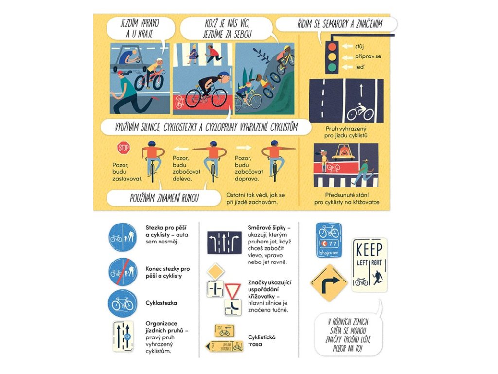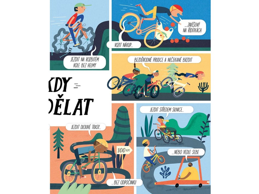HELE, MÁŠ KOLO Tak nasedej. Že nemáš? Nevadí! Vypůjčíme, pořídíme a vyjedeme ven! Silnicemi, silničkami, blátem i loužemi. Na kole se totiž dá jet kamkoli, kam si usmyslíš. S kolem jsi volný a nic tě nezastaví. Stačí prostě šlapat… a taky dávat pozor, co se děje na silnici. Ať už jsi zapálený cyklista, nebo se chceš cyklistou teprve stát, je dobré o svém kole něco vědět. Třeba jak si vybrat to pravé, jak si správně nastavit výšku sedátka, ale i to, co s kolem nikdy, vážně nikdy nedělat. A proč si o tom tedy nepřečíst? Třeba v této knížce. Je sice tenká, ale nabitá informacemi, a k tomu všemu zábavná. Nejenom že v ní zjistíš, proč je tak důležitá dobře nasazená helma a všechny možné i nemožné věci související s kolem a cyklistikou, ale projedeš se také veselým cyklobludištěm a na vlastní kůži pocítíš, proč je dobré, aby tvoje kolo mělo blatníky. Ale dost už řečí. Nasedej, vyrážíme do terénu!