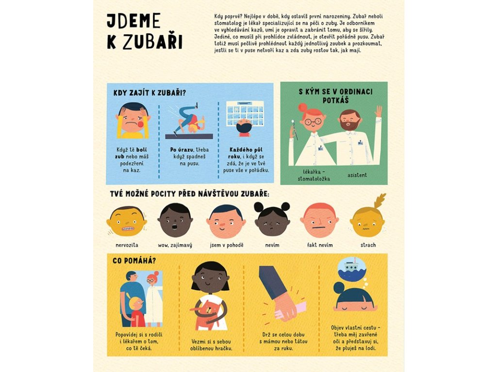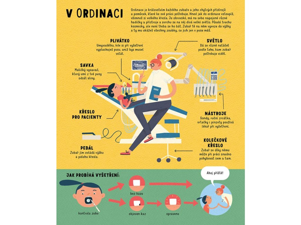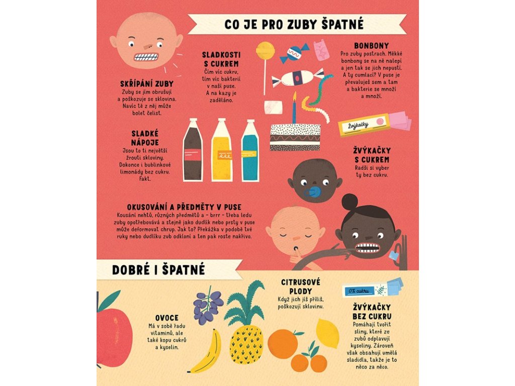 Kniha o zubech? To jako vážně?… Počkej, neříkej, že nechceš odhalit jejich zoubková tajemství! Jaká? No třeba: Odkud se zuby vlastně berou, jak vypadají uvnitř a proč občas umí bolet tak, až to hezké není. Nebo to, že v životě nám narostou jen dvoje a je tedy potřeba naučit se o ně opravdu dobře starat. Čím dřív, tím líp. Proto tato kniha o zubech. Naučí tě co a jak, a především proč! A i když tomu možná nevěříš, užiješ si s ní také spoustu zábavy. Vážně. Tak třeba, jak bys asi vypadal, kdybys měl zuby jako netopýr? Netušíš? Tak se pojď podívat…